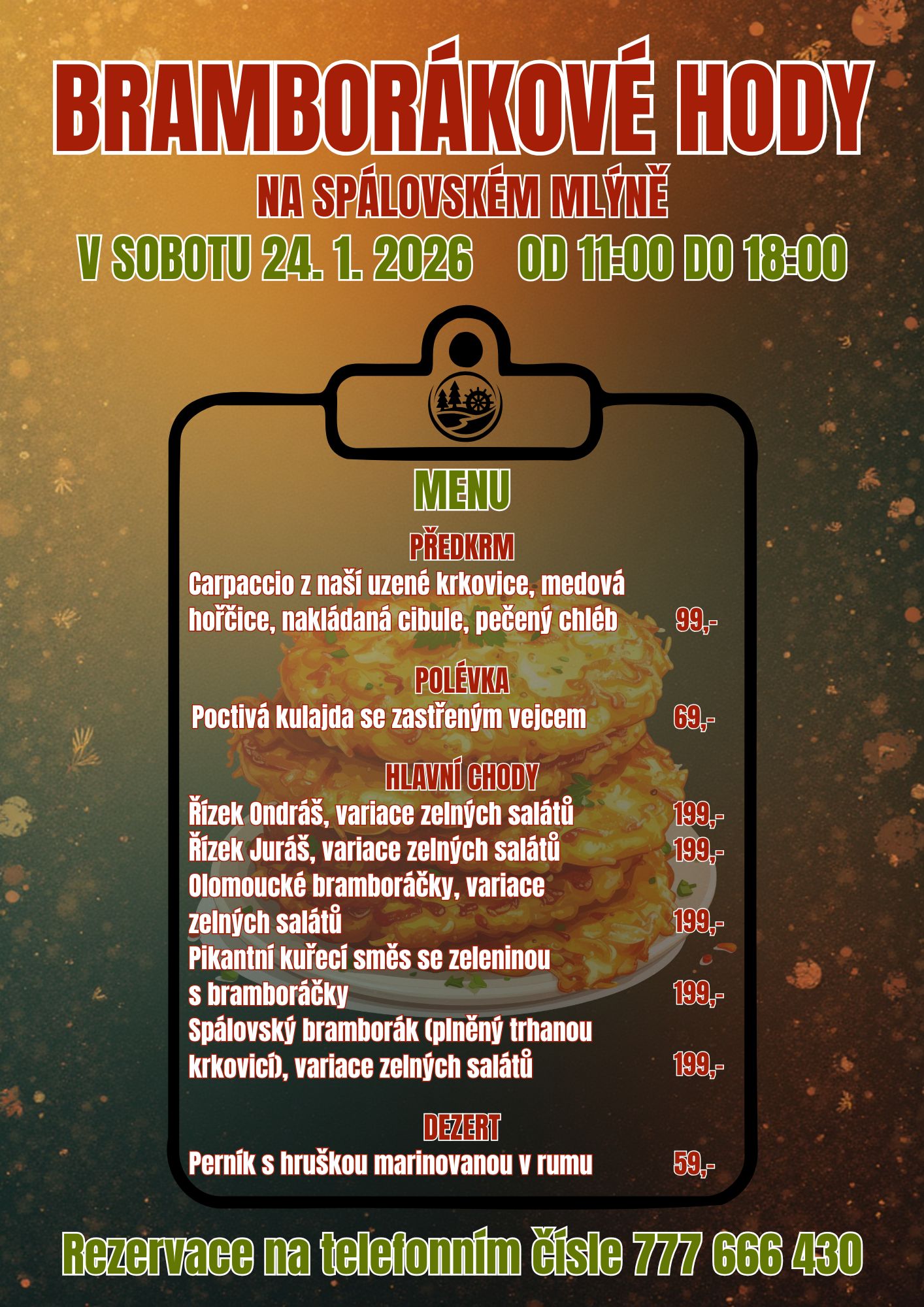 V sobotu 24. ledna 2026 se na Spálovském mlýně uskuteční tradiční Bramborákové hody, které potěší všechny fanoušky křupavých bramboráků, domácích specialit a zimní pohody.