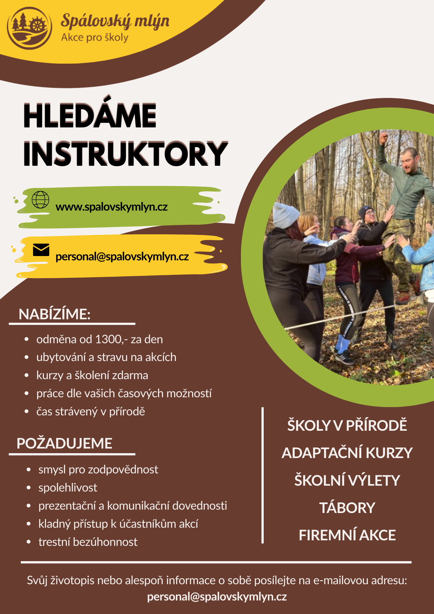 Na Spálovském mlýně jsme dobře sehraný tým a hledáme mezi sebe nové tváře na pozice INSTRUKTOR/KA.